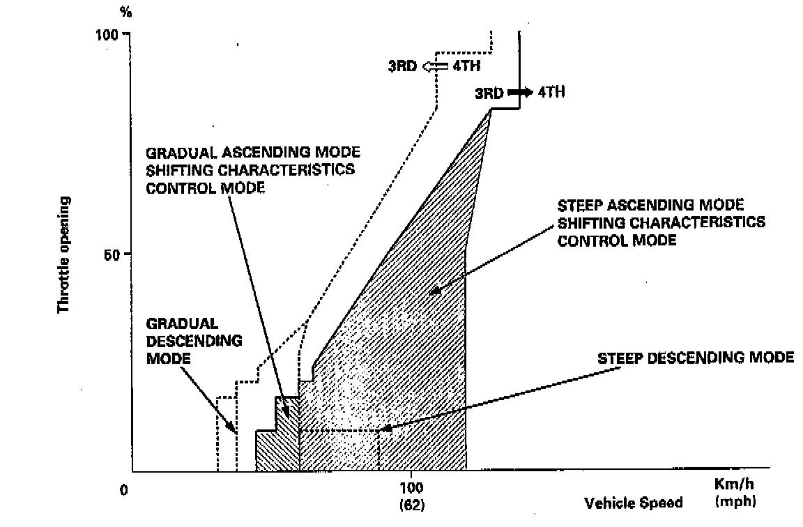 When the TCM determines that the vehicle is going down a hill in HI position, the shift-up speed from 3rd to 4th gear when the throttle is closed becomes faster than the set speed for flat road driving to widen the 3rd gear driving area. This, in combination with engine braking from the deceleration lock-up, achieves smooth driving when the vehicle is descending. There are two descending modes with different 3rd gear driving areas according to the magnitude of a gradient stored in the TCM. When the vehicle is in 4th gear, and you are decelerating on a gradual hill, or when you are applying the brakes on a steep hill, the transmission will downshift to 3rd gear. When you accelerate, the transmission will then return to 4th gear.