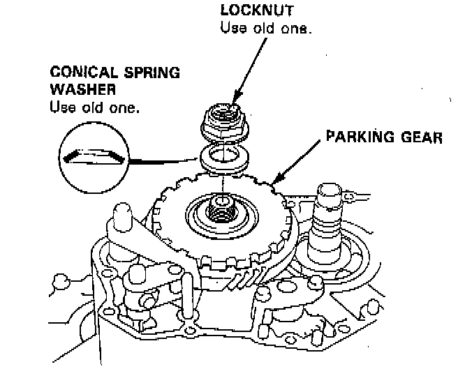 32. Install the old conical spring washer and locknut on the countershaft. Tighten the old locknut to seat the parking gear to the specified torque, then remove them.