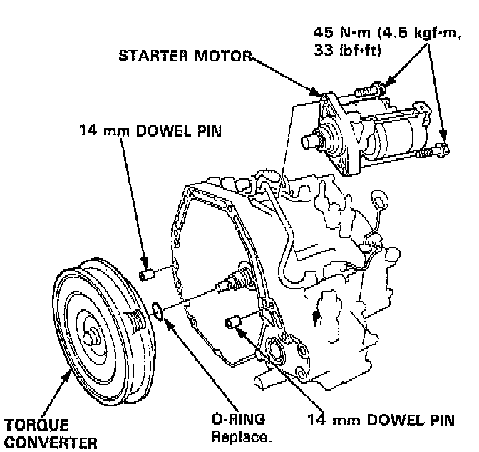 1. Flush the ATF cooler.2. Install the starter motor on the transmission housing, then install the two 14 mm dowel pins in the torque converter housing. Install the torque converter assembly securely with a new O-ring on the mainshaft.