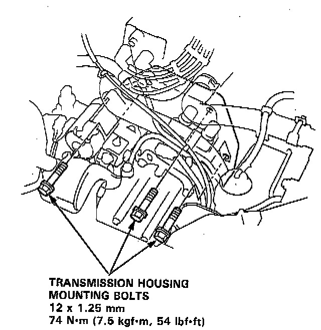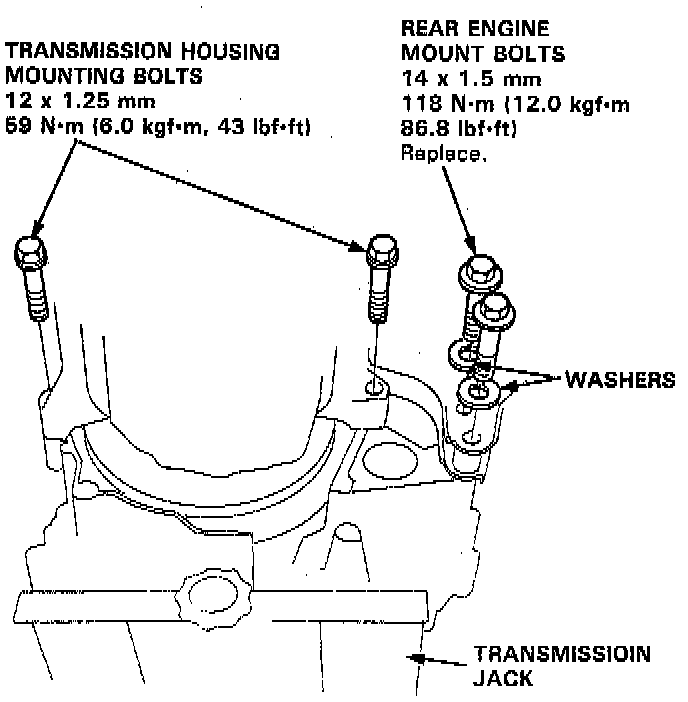 4. Attach the transmission to the engine, then install the transmission housing mounting bolts and two rear engine mounting bolts with new washers.