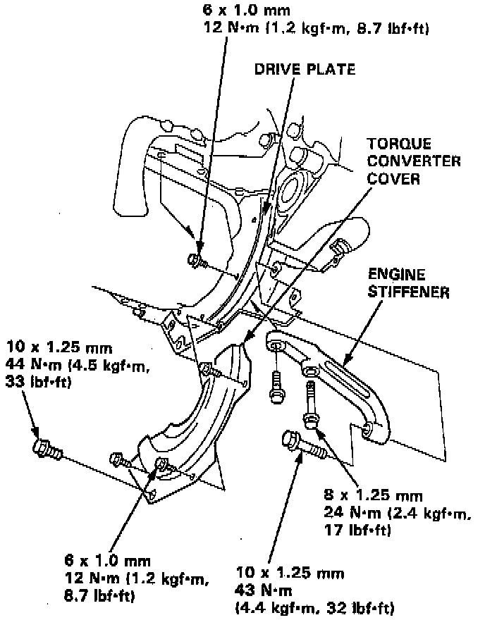 8. Attach the torque converter to the drive plate with eight bolts and torque as follows: Rotate the crankshaft as necessary to tighten the bolts to 1/2 of the specified torque, then to the final torque, in a crisscross pattern. After tightening the last bolts, check that the crankshaft rotates freely.