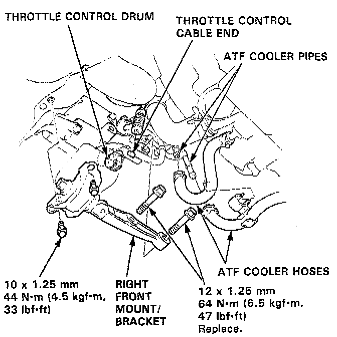 12. Connect the throttle control cable to the throttle control drum, and install the right front mount/bracket.