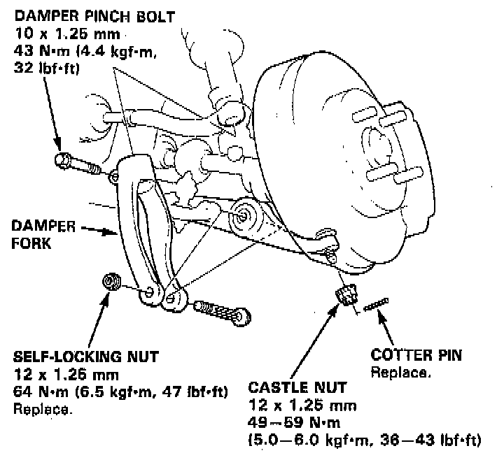 18. Install right damper fork, then install the right and left ball joints to each lower arm with the castle nuts and new cotter pins.
