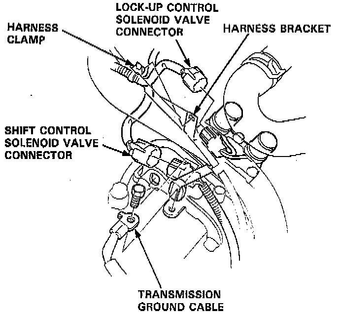 21. Connect the lock-up control solenoid valve connector and shift control solenoid valve connector, then clamp the lock-up control solenoid harness with the harness bracket.