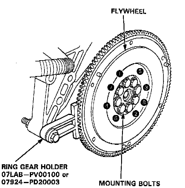 2. Remove the flywheel mounting bolts in a crisscross pattern in several steps as shown, then remove the flywheel.