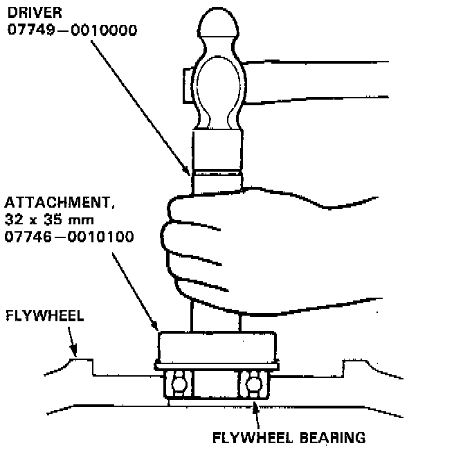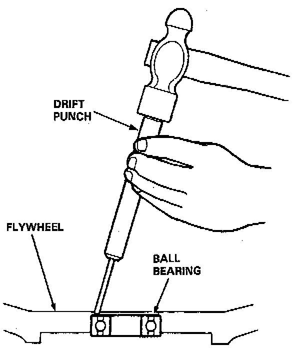 4. Drive the new flywheel bearing into the flywheel using the special tools as shown.