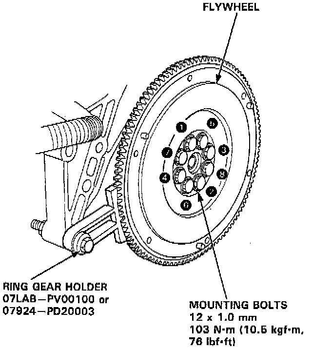 6. Install the special tool as shown, then torque the flywheel mounting bolts in a crisscross pattern in several steps as shown.