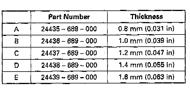 6. If the clearance is not within the standard, select and install the appropriate 10 mm shim for the correct clearance from the chart.