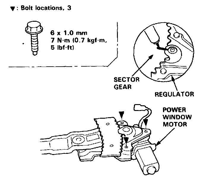 NOTE: Before removing the power window motor, mark the location by scribing a line across the sector gear and regulator.