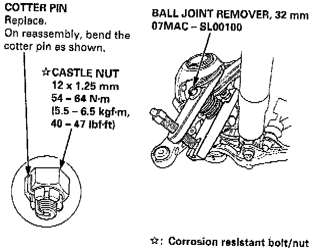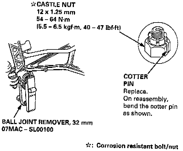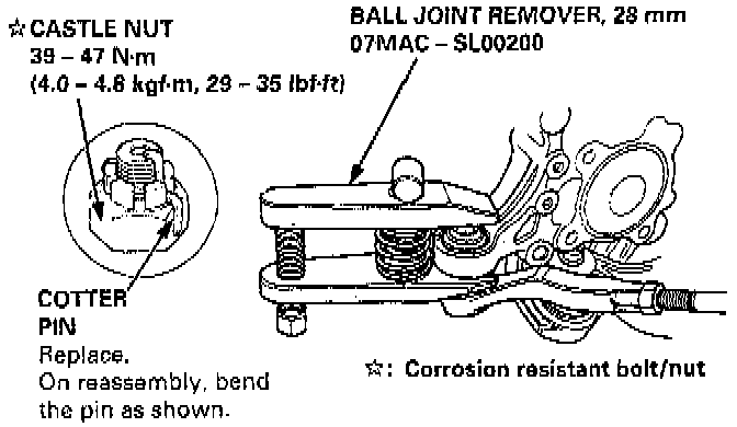 CAUTION: Use the ball joint removers to separate the ball joints from the suspension or steering arm. Be careful not to damage the ball joint boot. Torque the castle nut to the lower torque specification, then tighten it only far enough to align the slot with the pin hole. Do not align the nut by loosening.