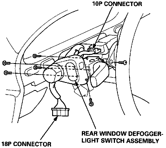 6. Remove the six screws, then remove the rear window defogger-light switch assembly.