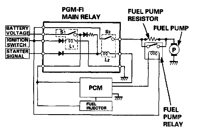 This PGM-FI main relay is located behind the dashboard lower cover. The PGM-FI main relay actually contains two individual relays. One relay is energized whenever the ignition is on. It supplies battery voltage to the PCM, power to the fuel injectors, and power for the second relay. The second relay is energized for 2 seconds when the ignition is switched on, and when the engine is running. It supplies power to the fuel pump.