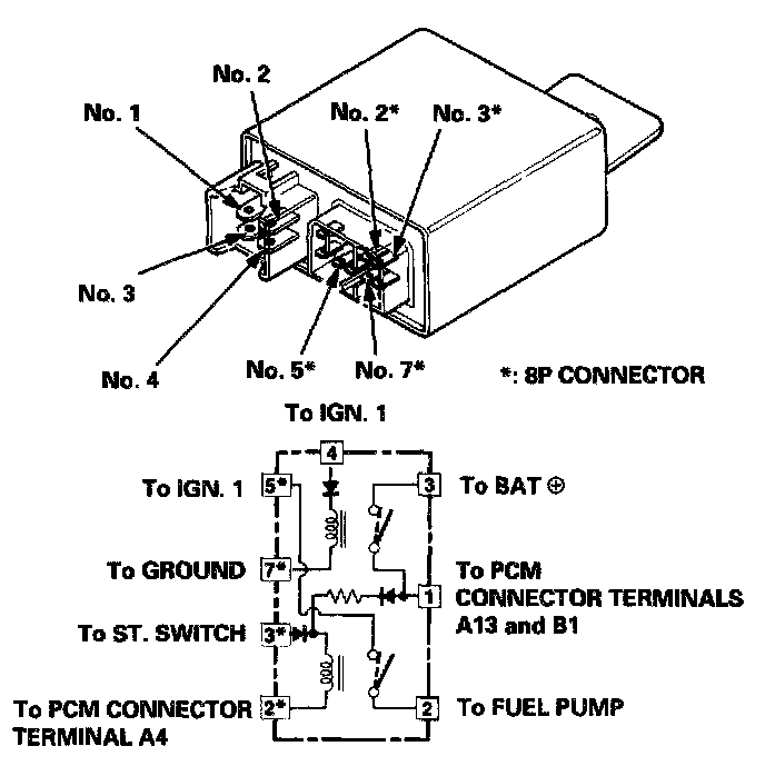 4. Attach the battery positive terminal to the No.1 terminal and battery negative terminal to the No.2* terminal of the PGM-FI main relay. Then check that there is continuity between the No.5* terminal and No.2 terminal of the PGM-FI main relay.