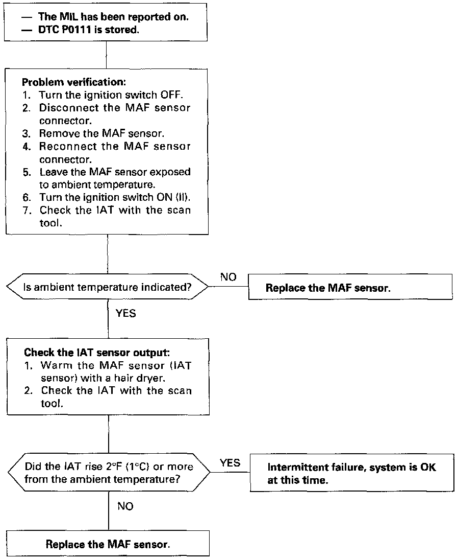 The scan tool indicates Diagnostic Trouble Code (DTC) P0111: A range/performance problem in the Intake Air Temperature (IAT) Sensor circuit.