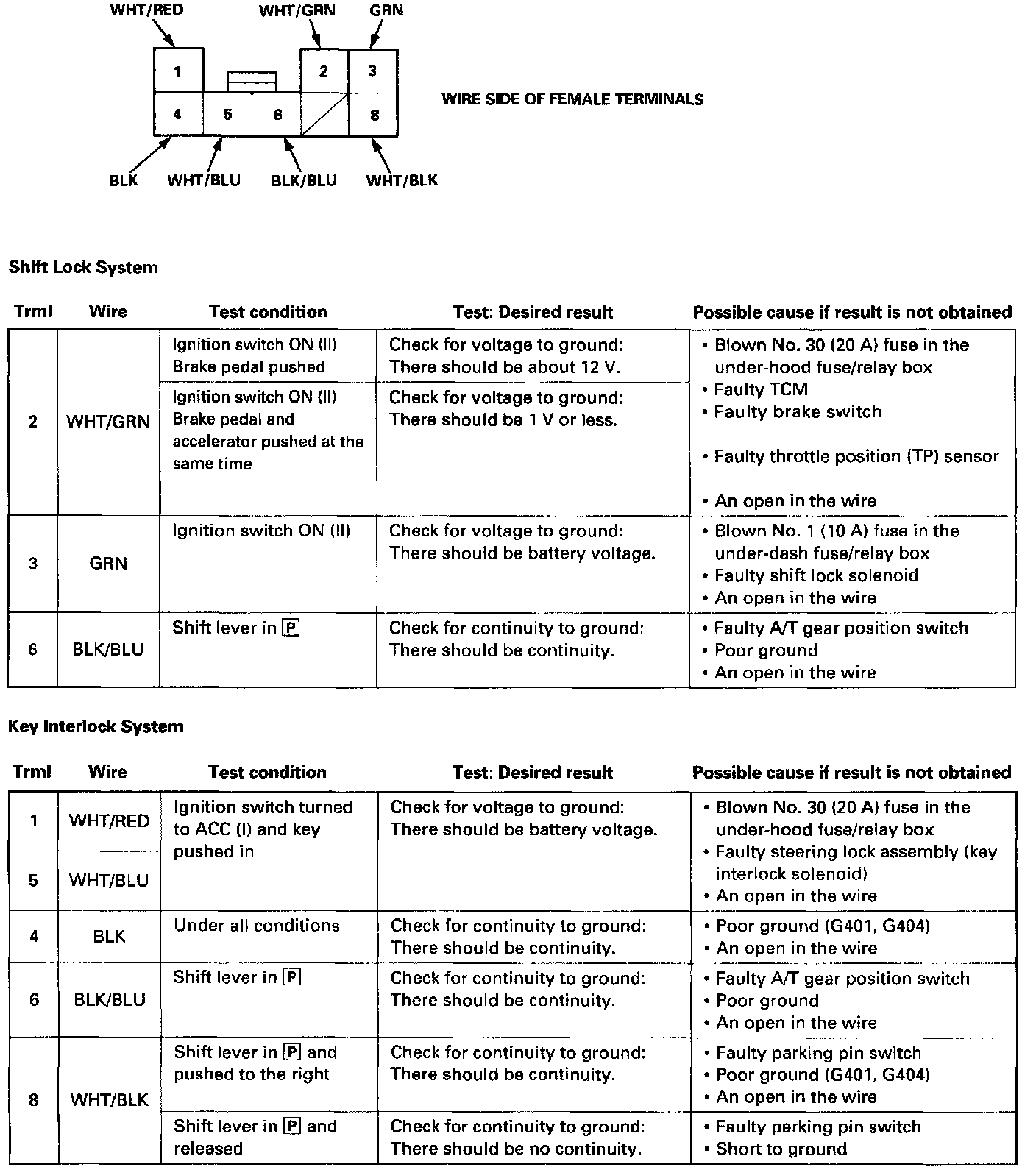 NOTE: If the shift lock solenoid clicks when the ignition switch is turned ON (II) and you step on the brake pedal (with the shift lever in [P]), the shift lock system is electronically normal; if the shift lever cannot be shifted from [P], test the A/T gear position switch.