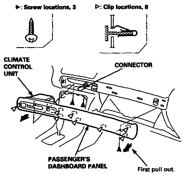 3. Remove the screws, then carefully pull out the passenger's dashboard panel and climate control unit as an assembly. Disconnect the connectors from the climate control unit.