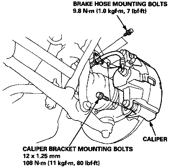 CAUTION: To prevent accidental damage to the caliper or brake hose, use a short piece of wire to hang the caliper from the undercarriage.