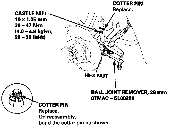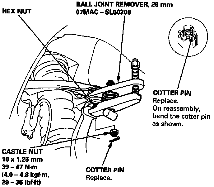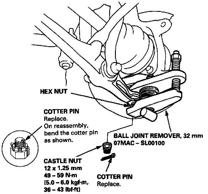25. Install a 12 mm hex nut on the ball joint. Be sure that the hex nut is flush with the ball joint pin end, or the threaded section of the ball joint pin might be damaged by the ball joint remover.