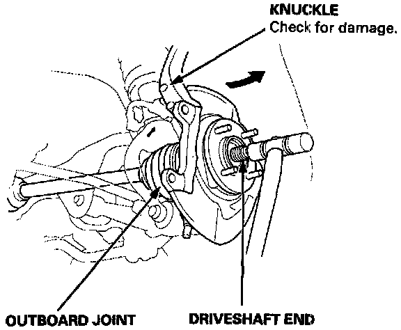 27. Pull the knuckle outward, and remove the driveshaft outboard joint from the knuckle by tapping the driveshaft end using a plastic hammer, then remove the knuckle.