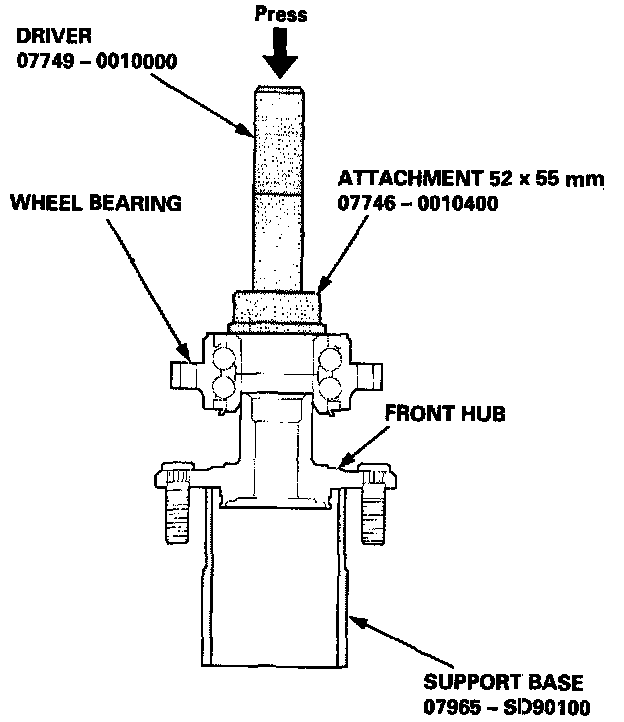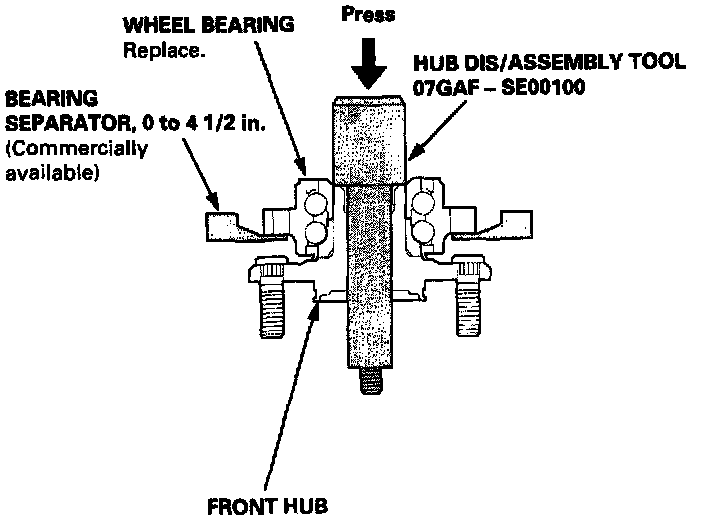 3. Separate the wheel bearing from the front hub using the special tools and a press as shown.