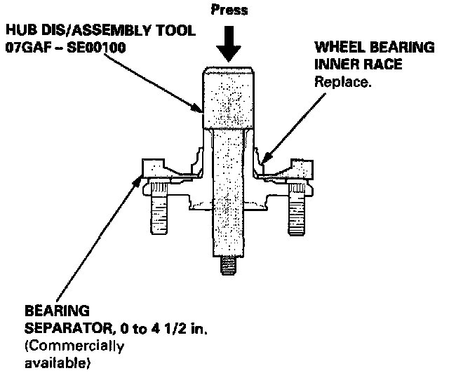 4. Press the wheel bearing inner race from the hub using the special tools and a bearing separator as shown.