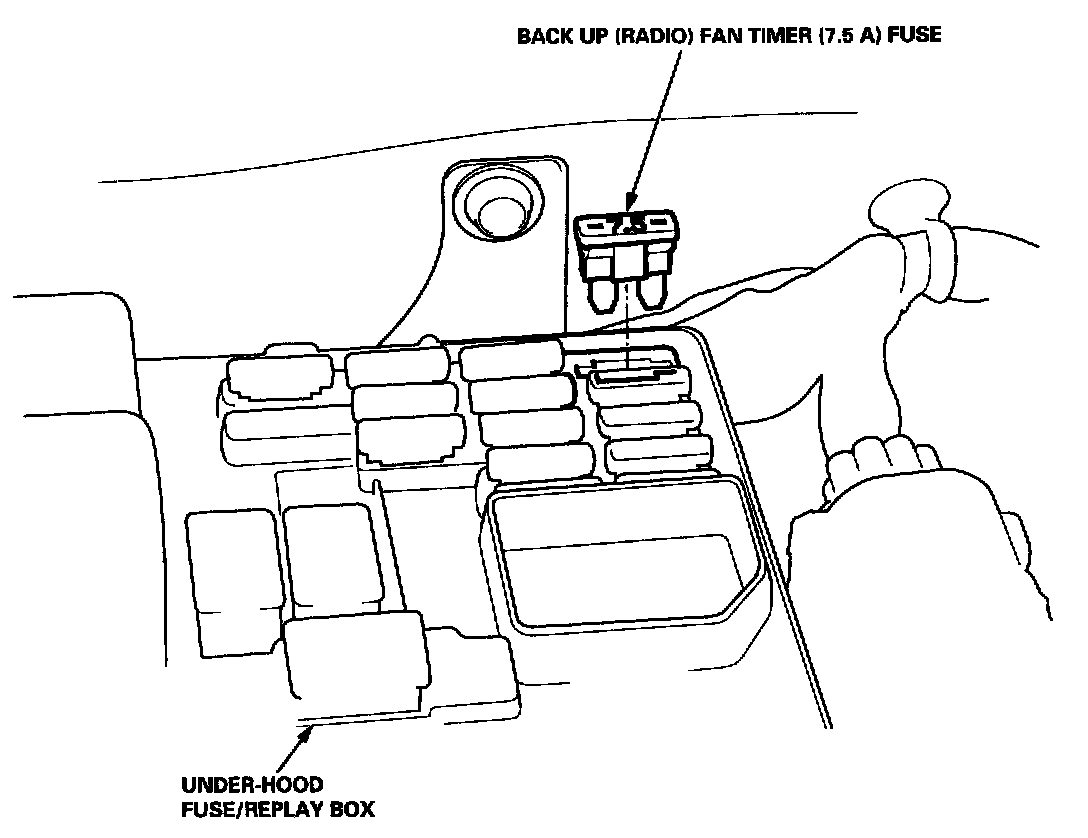 - Turn the ignition switch OFF. Remove the CLOCK RADIO (7.5 A) fuse from the under-hood fuse/relay box for 10 seconds.