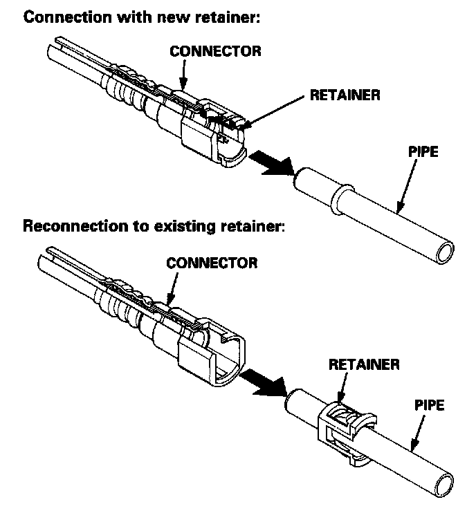 4. Align the quick-connect fittings with the pipe, and align the retainer locking pawls with the connector grooves. Then press the quick-connect fittings onto the pipe until both retainer pawls lock with a clicking sound. If it is hard to connect, put a small amount of new engine oil on the pipe end.