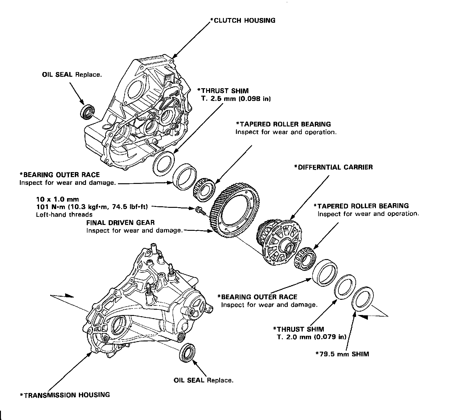 If parts marked with an asterisk (*) were replaced, the tapered roller bearing preload must be adjusted.