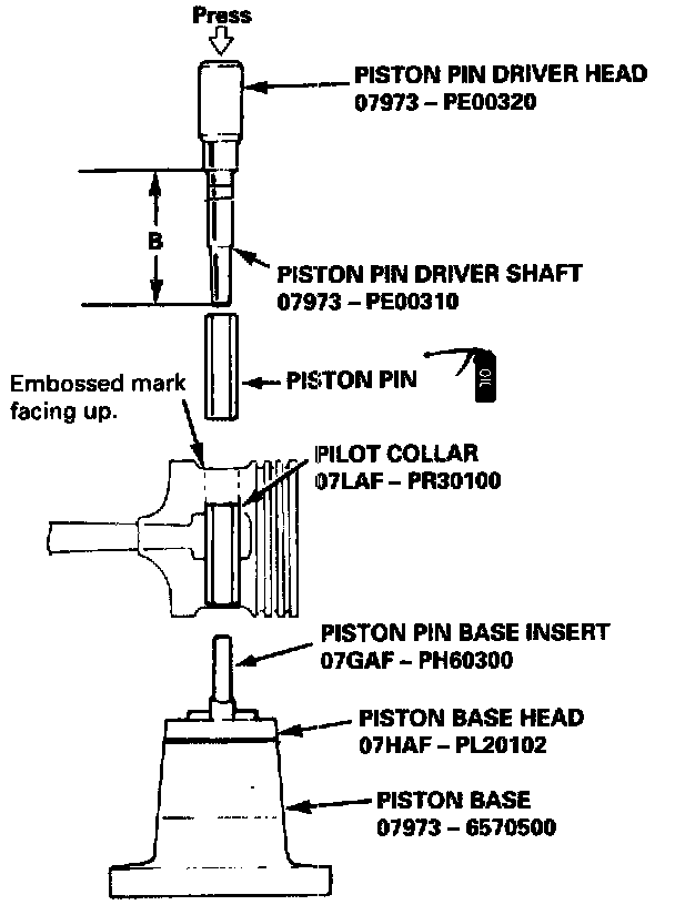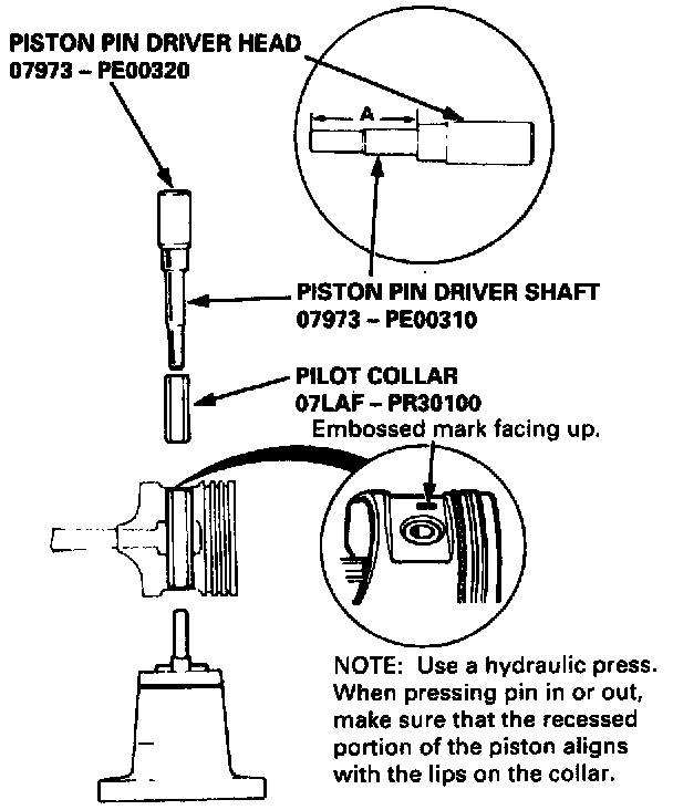 NOTE: Use a hydraulic press. When pressing pin in or out, make sure that the recessed portion of the piston aligns with the lugs on the piston base head.