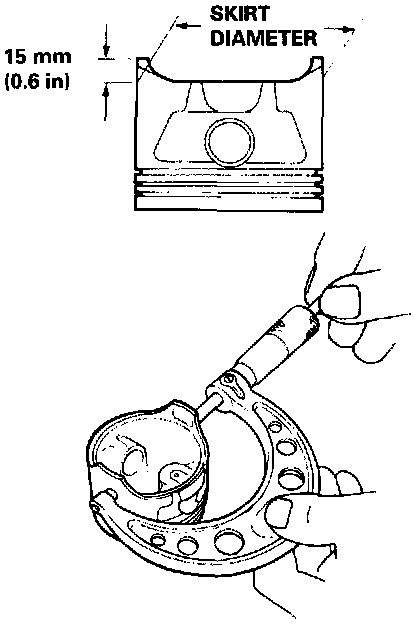 2. Measure the piston diameter at a point 15 mm (0.6 inch) from the bottom of the skirt.