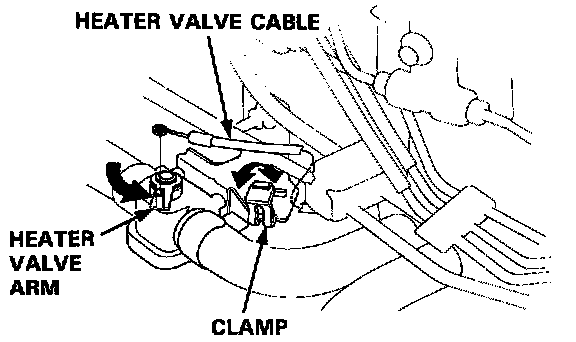 Heater Valve Cable1. Disconnect the heater valve cable from the heater valve arm and the clamp, and from the heater control arm and the clamp.
