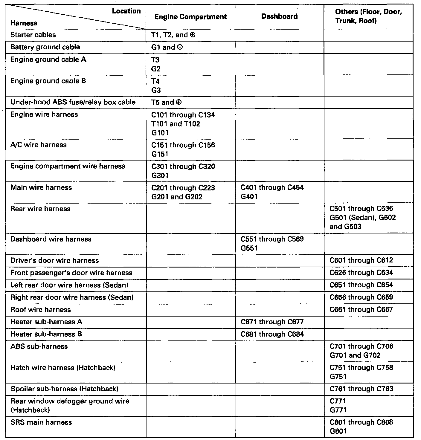 Identification numbers have been assigned to all connectors. The number is preceded by the letter "C", for connectors, "G", for single ground terminals or "T" for single non-ground terminals.