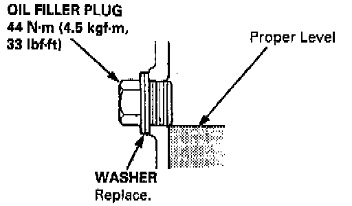 2. The oil level must be up to the filler hole. If it is below the hole, add oil until it runs out, then reinstall the oil filler plug.