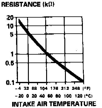 The IAT Sensor is a temperature dependant resistor (thermistor). The resistance of the thermistor decreases as the intake air temperature increases as shown above.