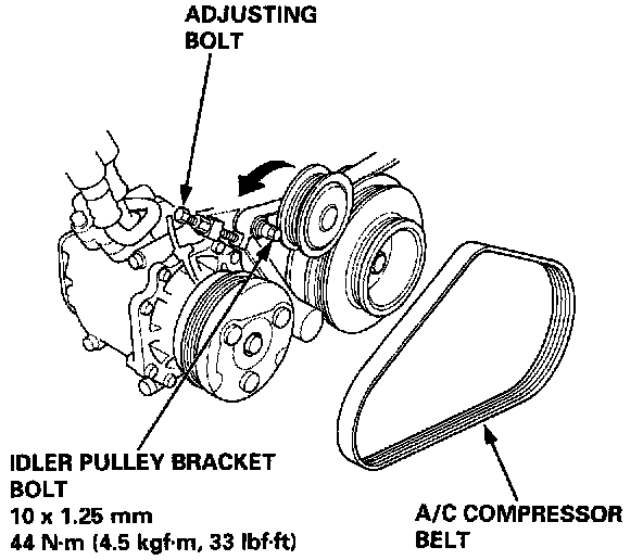 3. Loosen the adjusting bolt and idler pulley bracket bolt, then remove the A/C compressor belt.