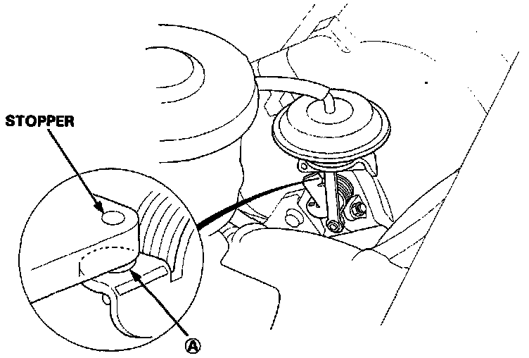 3. With the engine at idle, check that (A) of the IAB control valve is in close contact with the stop when vacuum hose is disconnected.