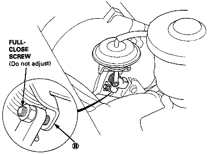 4. With the engine at idle, check that (B) of the IAB control valve is in close contact with the full-close screw when the vacuum hose is connected.