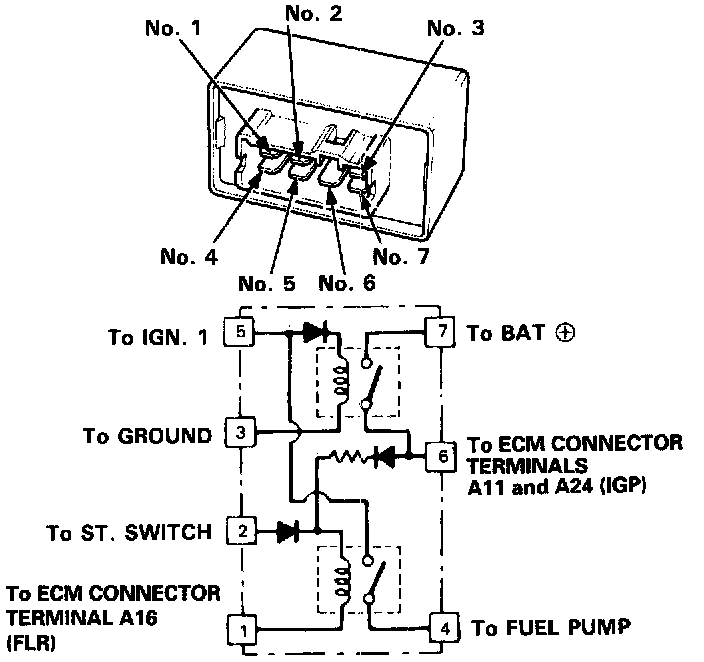 3. Attach the battery positive terminal to the No. 5 terminal and the battery negative terminal to the No. 3 terminal of the PGM-FI main relay. Then check that there is continuity between the No. 7 terminal and No. 6 terminal of the PGM-FI main relay.
