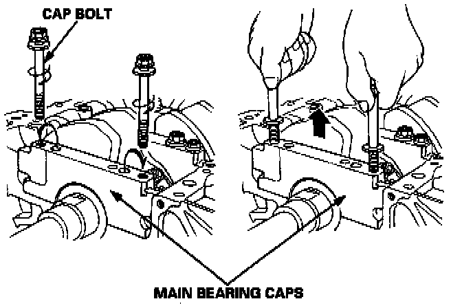 15. Remove the bearing cap bolts and bearing cap side bolts, then remove the bearing cap.