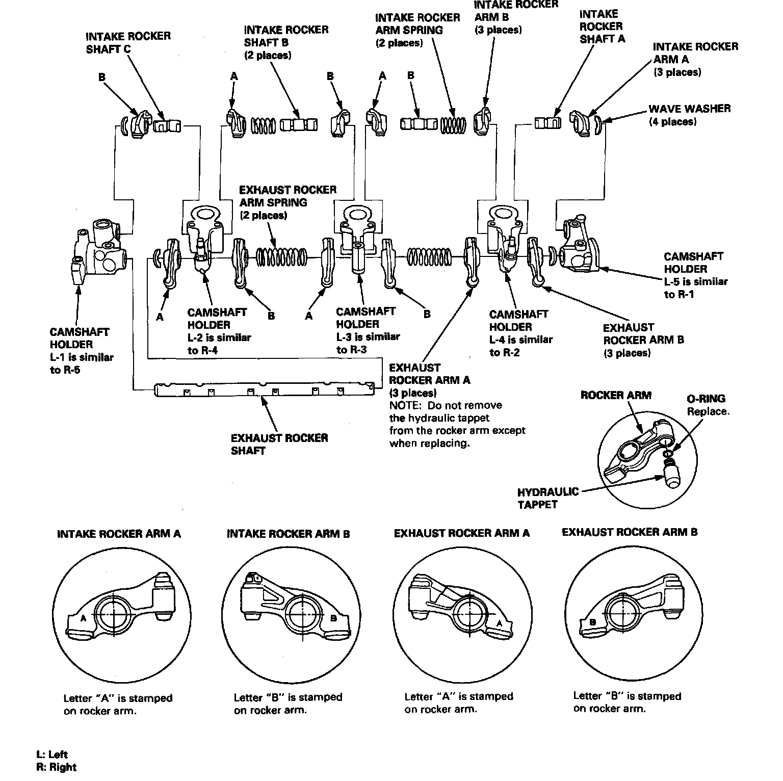 - When removing the rocker arm assembly, do not remove the camshaft holder bolts. The bolts will keep the camshaft holders, the springs and the rocker arms on the shahs.