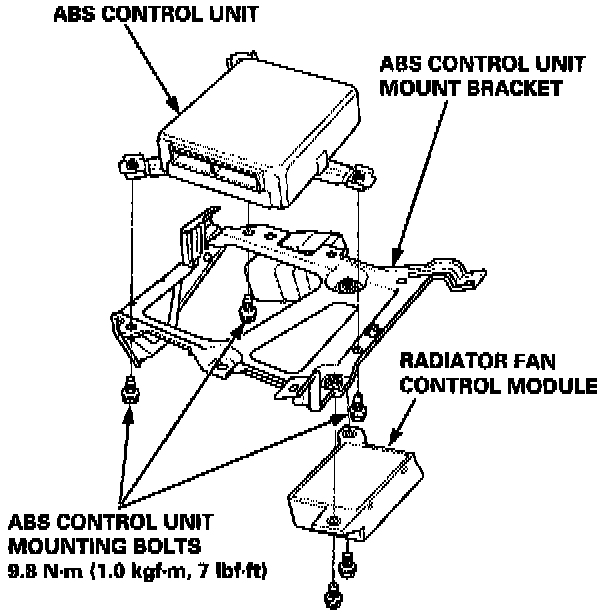6. Remove the radiator fan control module and three ABS control unit mounting bolts.