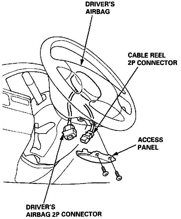 2. '95 - 96 models: Reconnect the driver's airbag 2P connector to the cable reel 2P connector, and reinstall the access panel on the steering wheel.