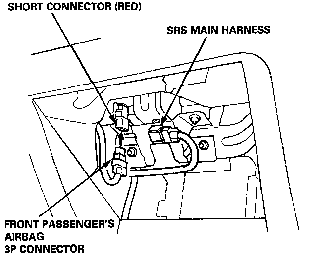 ^ Disconnect the front passenger's airbag 3P connector from the SRS main harness, then connect the short connector (RED) to the front passenger's airbag 3P connector.