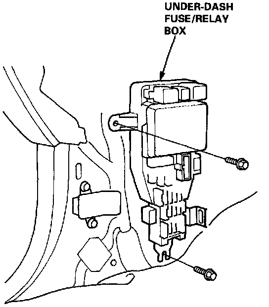 7. Remove the two mounting bolts, and pull the under- dash fuse/relay box away from the left kick panel.
