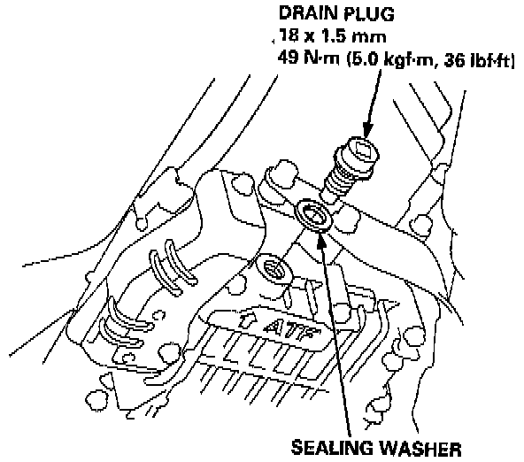 1. Bring the transmission up to normal operating temperature (the radiator fan comes on) by driving the vehicle. Park the vehicle on level ground, turn the engine off, and remove drain plug.