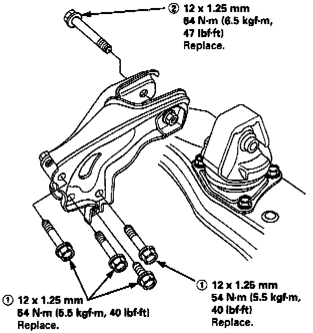 5. Install the rear mount bracket, then tighten the bolts in the numbered sequence as shown ((1) - (2)).