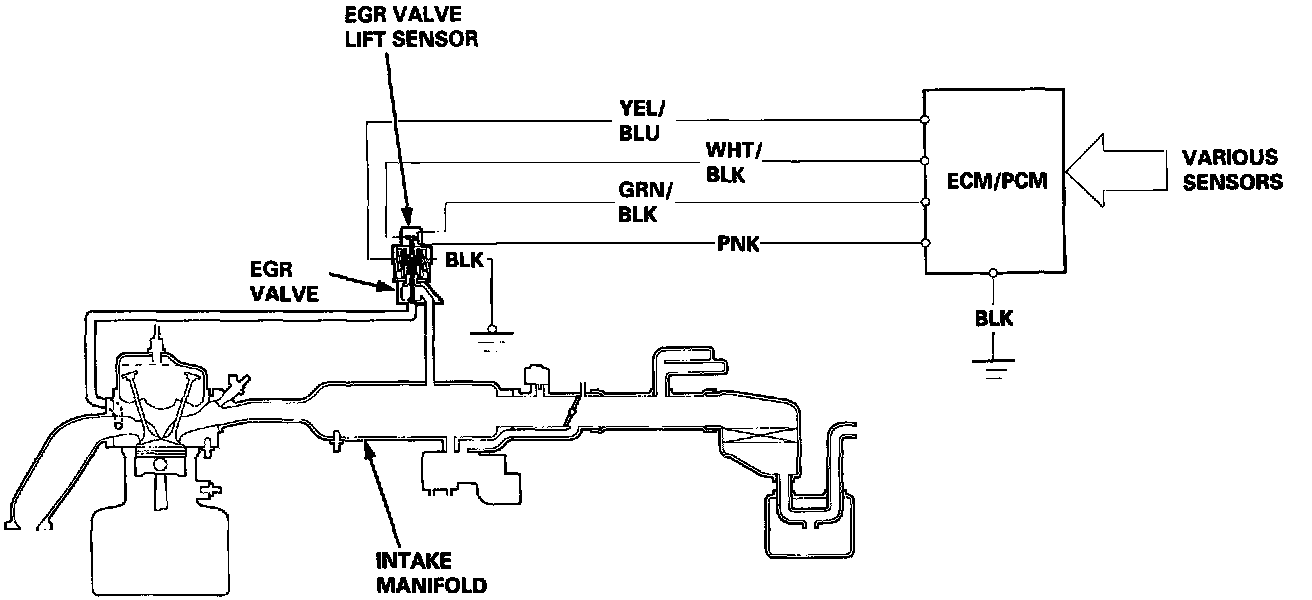 The EGR valve lift sensor detects the amount of EGR valve lift and sends it to the ECM/PCM. The ECM/PCM then compares it with the ideal lift in its memory (based on signals sent from other sensors). If there is any difference between the two, the ECM/PCM cuts current to the EGR valve.