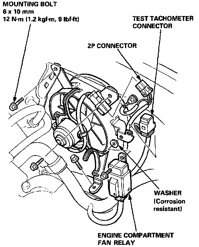 1. Disconnect the 2P connector from the engine compartment fan motor.