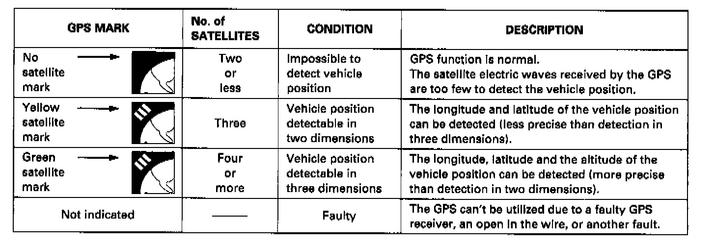 The Global Positioning System (GPS) enables the navigation system to determine the current position of the vehicle by utilizing the electric waves transmitted from the satellites in orbit around the earth. The satellites transmit the satellite identification signal, orbit information, transmission time signal, and other information. When the GPS receiver receives the electric waves from three or more satellites simultaneously, it calculates the current position of the vehicle based on the distance to each satellite and the satellite positions on their respective orbits.