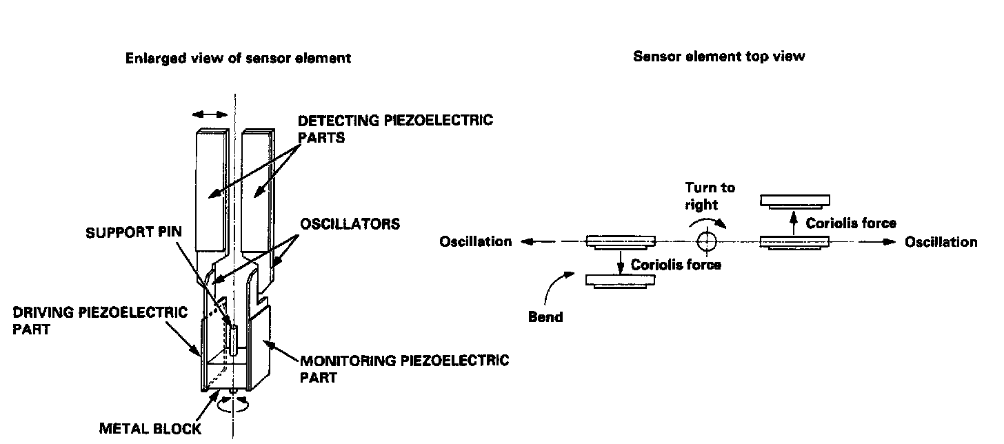 The piezoelectric parts have "electric/mechanical transfer characteristics." The piezoelectric parts bend vertically when voltage is applied to both sides of the parts, and voltage is generated between both sides of the piezoelectric parts when then are bent by an external force. The oscillation gyro functions by utilizing this characteristic of the piezoelectric parts and "Coriolis force." (Coriolis force deflects moving objects as a result of the earth's rotation.) In the oscillation gyro, this force moves the sensor element when the angular velocity is applied.